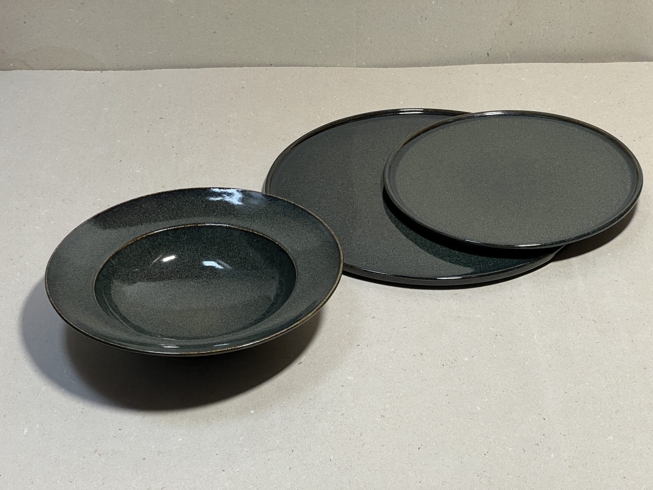 Tellersatz bestehend aus einem grossen flachen Teller, einem kleinen flachen Teller sowie einem Pasta-Suppenteller. Nicht auf Lager. Wird auf Bestellung angefertigt. Farbe wählbar aus Sortiment. Kombination verschiedener Farben möglich ohne Aufpreis. Der Preis versteht sich für einen Satz aus grossem Teller, kleinem Teller und Pasta-Suppenteller. Bestellung möglich ab 4er Set. Wahlweise können auch nur grosse Teller (35.-), kleine Teller (25.-) oder Pasta-Suppenteller (30.-) bestellt werden, jeweils ab 6 Stück. Rückfragen und individuelle Bestellungen bitte an dani@lehmatelier.ch richten. Gewünschte Farbe (nur Farben aus dem Sortiment – siehe Bildergalerie) bitte bei der Bestellung angeben. Wahlweise auch mit dunkelgrauem oder schwarzem Rand. Das Produktbild zeigt den vollständigen Satz in schwarz (A85b).